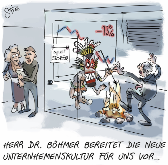 Warum zeigt die Karikatur einen drastischen Rückgang von -93 % auf der Geschäftsgrafik im Hintergrund?