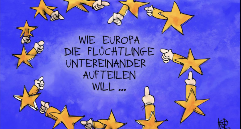 Welche zentrale Botschaft vermittelt die Karikatur über den Umgang Europas mit der Flüchtlingsverteilung?