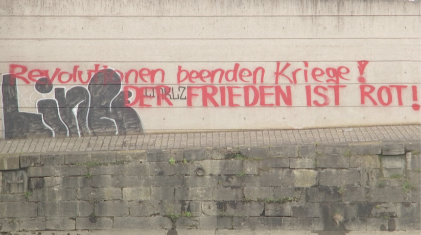 Welche zentrale politische oder ideologische Botschaft vermittelt das Graffiti, insbesondere mit den Aussagen „Revolutionen beenden Kriege“ und „Der Frieden ist rot“?