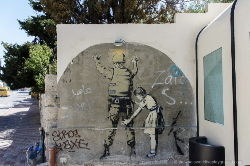 Wie nutzt Banksy Stilmittel wie Schablonenkunst (Stencil Art) und Schwarz-Weiß-Kontraste, um die Botschaft zu verstärken?