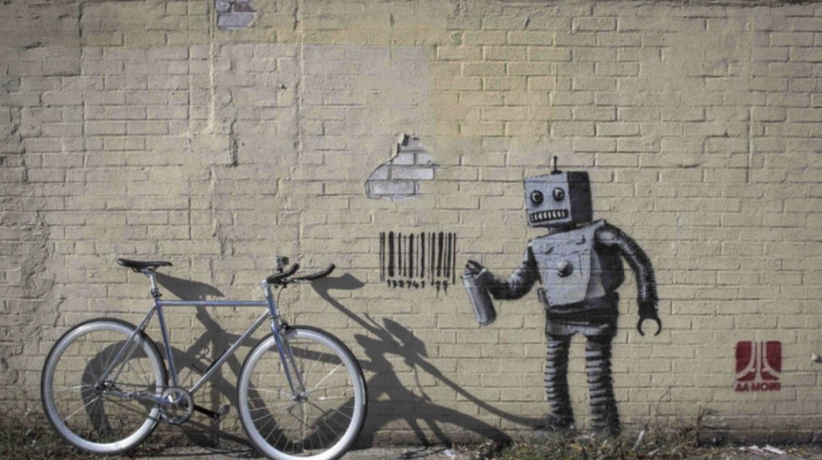 Welche Wirkung hat die Kombination aus realen Objekten (Fahrrad) und Graffiti (Roboter, Barcode)?