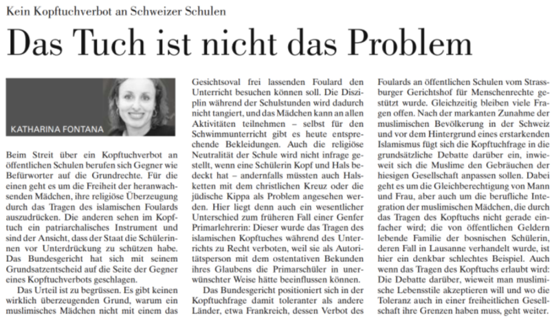 Welche gesellschaftlichen und politischen Hintergründe beeinflussen die Debatte über das Kopftuch in der Schweiz laut dem Artikel?