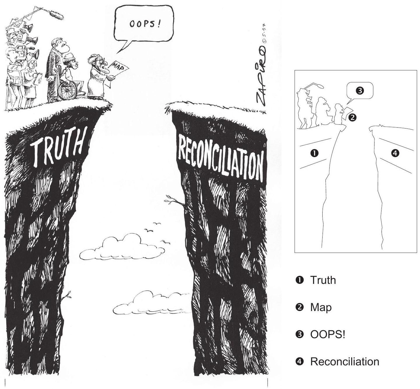 "Truth And Reconciliation - The Gap". A newspaper cartoon by Zapiro, published in South Africa.