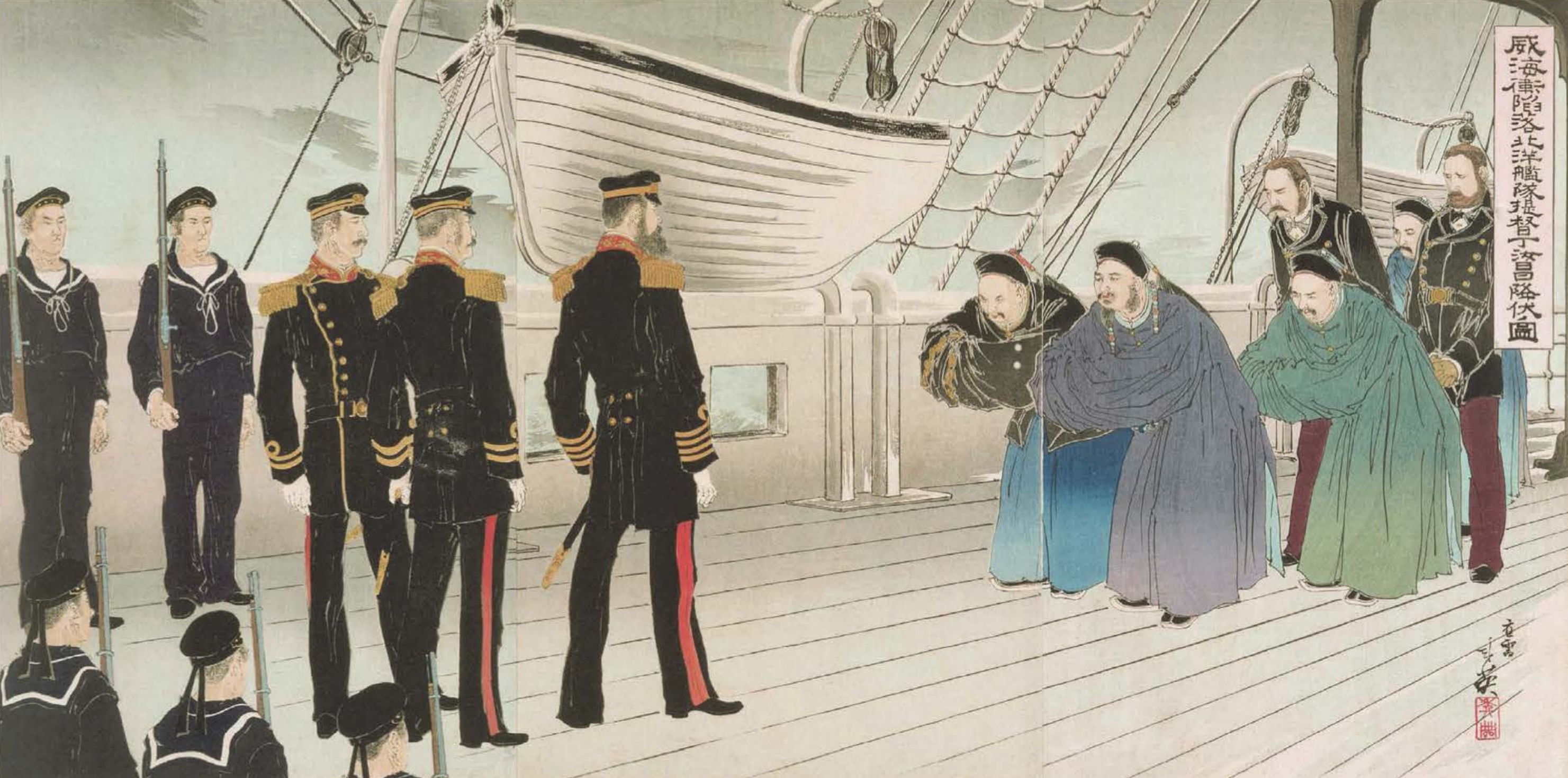 A Japanese artist depicts Chinese officials surrendering to naval officers in 1895