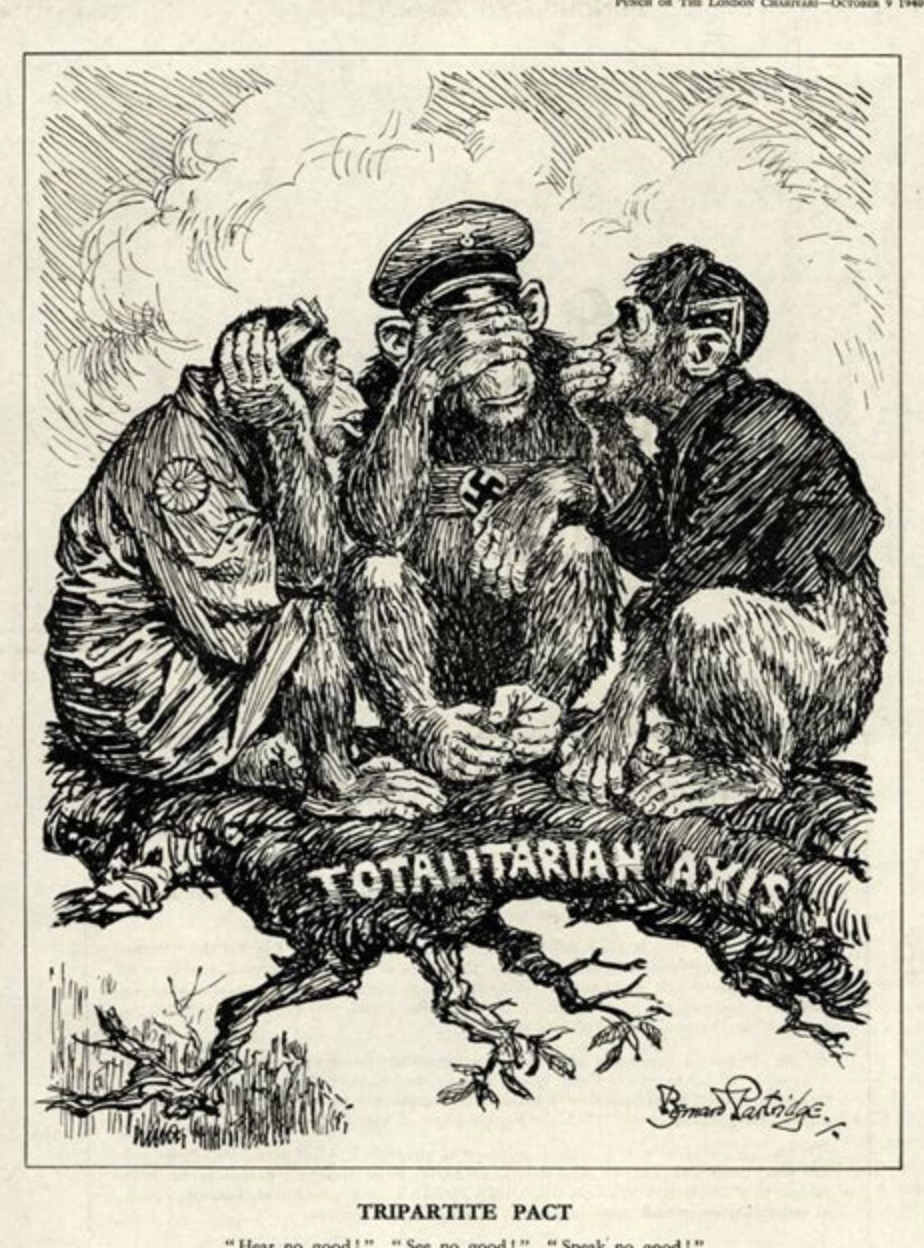 Political cartoon, 1940, international satirical publication. The cartoon depicts Hitler, Mussolini, and a Japanese figure as three monkeys enacting the proverb “see no evil, hear no evil, speak no evil.” They sit on a pedestal labelled “Totalitarian Axis.”
