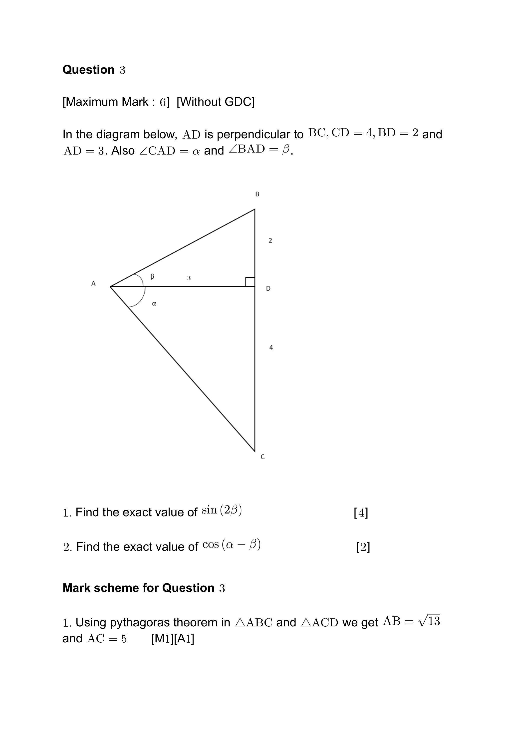 Practice AHL 3.10—Compound angle identities with authentic IB Mathematics Analysis and Approaches (AA) exam questions for both SL and HL students. This question bank mirrors Paper 1, 2, 3 structure, covering key topics like functions and equations, calculus, complex numbers, sequences and series, and probability and statistics. Get instant solutions, detailed explanations, and build exam confidence with questions in the style of IB examiners.