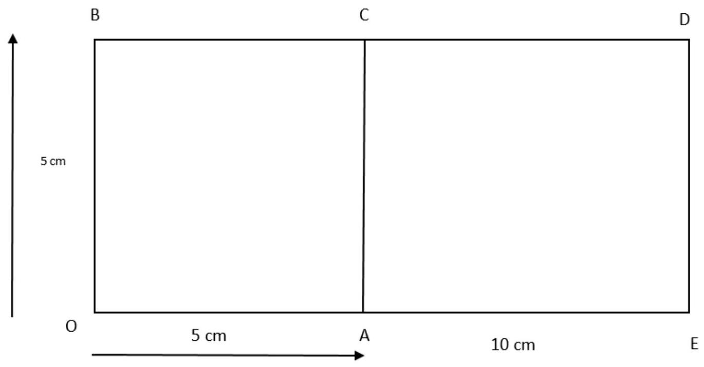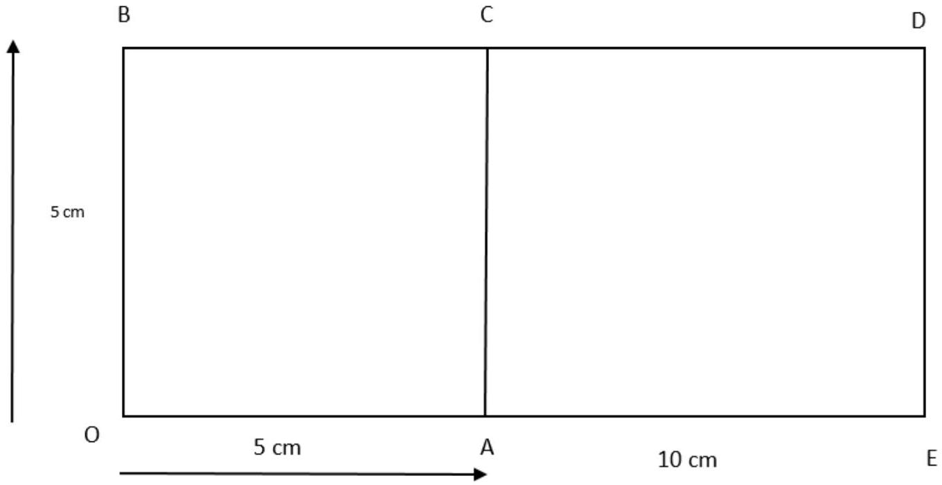 In the following diagram OBCA is a square of side 5 cm while ACDE is a rectangle of length 10 cm and width 5 cm . Let and