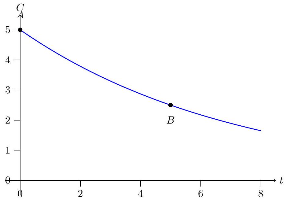 The initial concentration is , and after 5 hours, the concentration is . All concentrations are given correct to one decimal place.