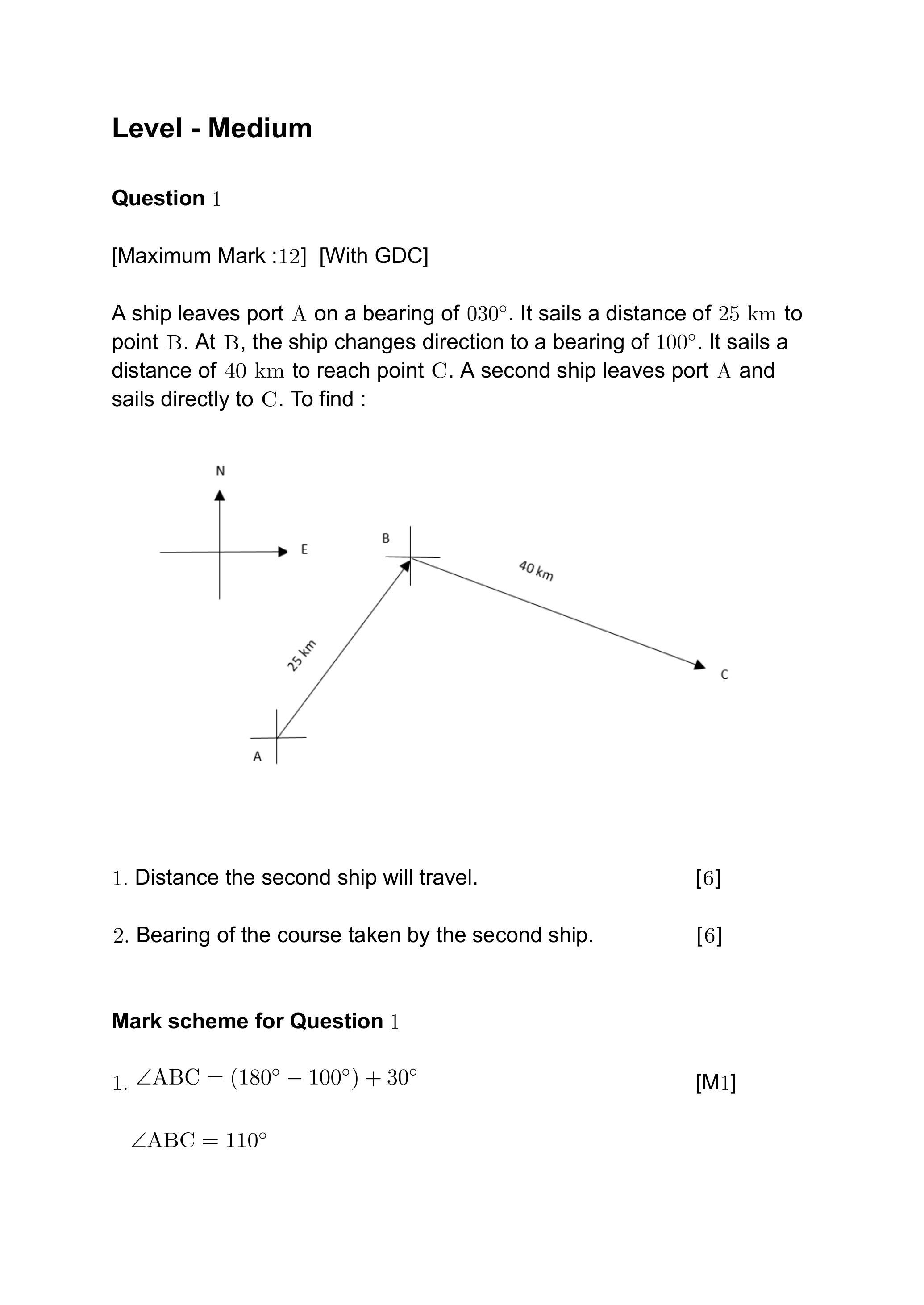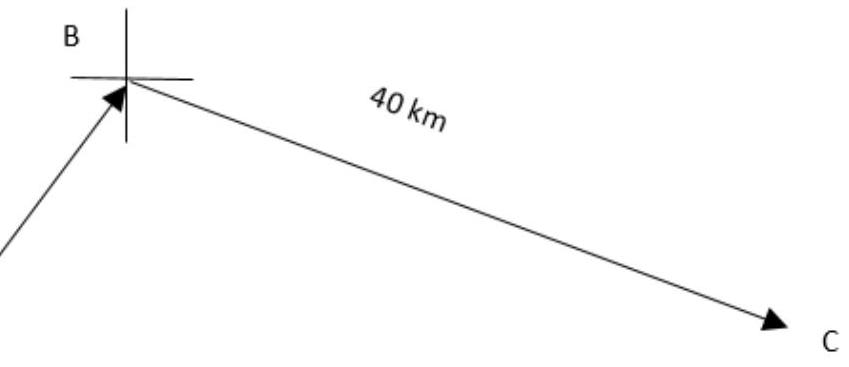 A ship leaves port A on a bearing of . It sails a distance of 25 km to point B . At B , the ship changes direction to a bearing of . It sails a distance of 40 km to reach point C . A second ship leaves port A and sails directly to C . To find :