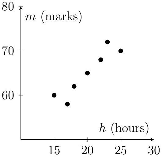 A teacher investigates the relationship between the number of revision hours, , and exam marks, , for seven students. The mean revision hours is 20 , and the mean exam mark is 65 .