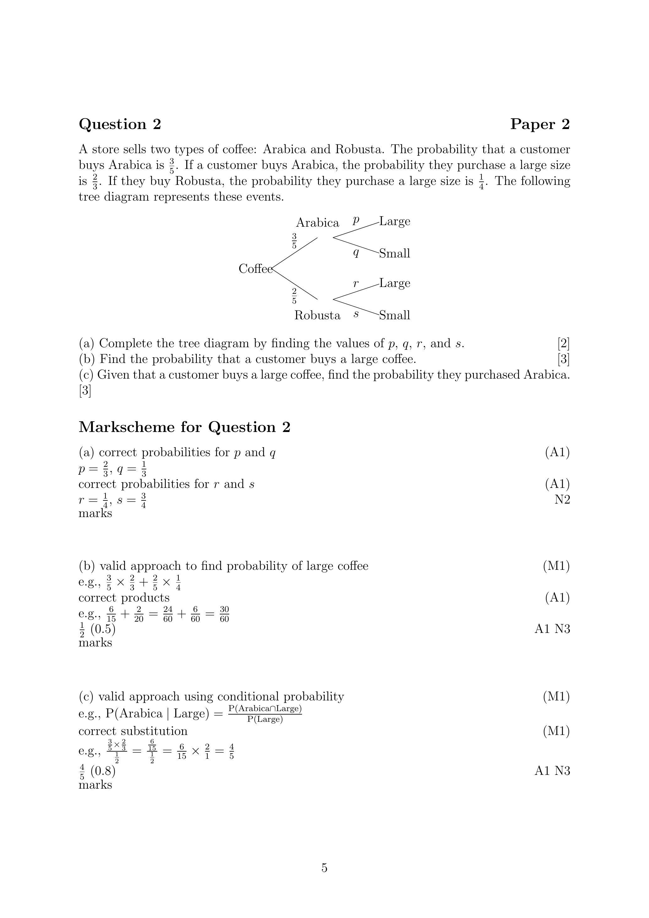 A store sells two types of coffee: Arabica and Robusta. The probability that a customer buys Arabica is . If a customer buys Arabica, the probability they purchase a large size is . If they buy Robusta, the probability they purchase a large size is . The following tree diagram represents these events.