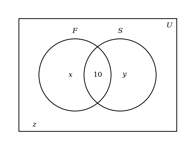 In a group of 60 students, 35 study French, 30 study Spanish, and 10 study both languages. Let represent the event "studies French" and represent the event "studies Spanish". The following Venn diagram shows these events, with , and representing numbers of students.