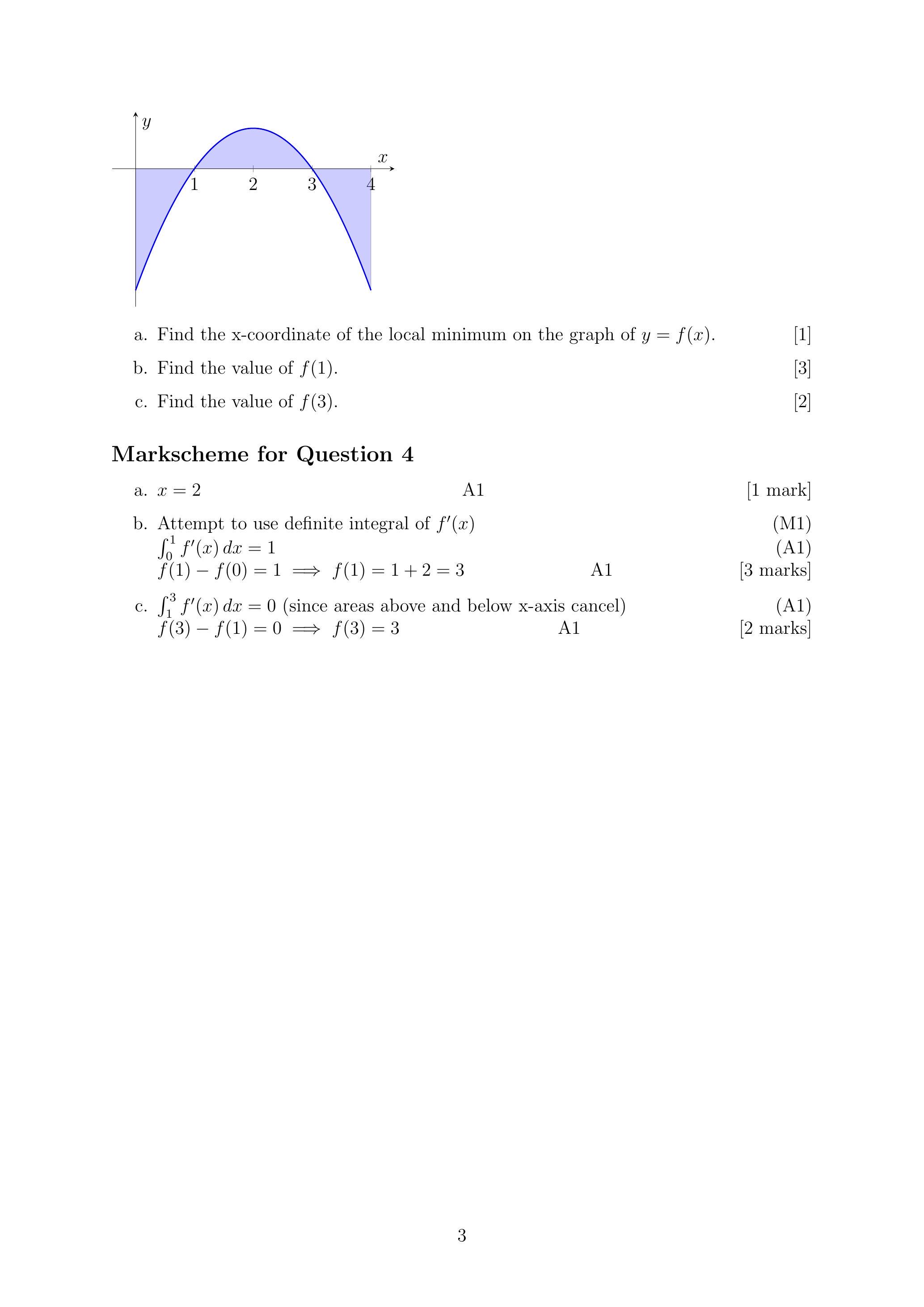 The graph of , is shown below. The curve intercepts the x -axis at and and has a local maximum at . The area enclosed by the curve and the x -axis between and is 1 . Given ,