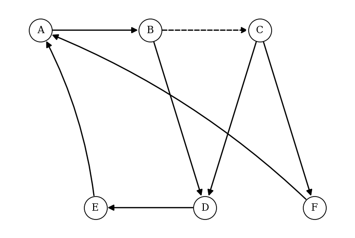 A robot navigates a grid of six rooms, , and . The possible movements between rooms are represented by a directed graph. Some paths are marked with sensors (indicated by dashed edges); these paths have twice the probability of being chosen compared to normal paths from the same room.