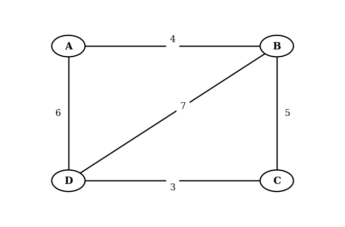 Create a weighted adjacency matrix for the graph, with vertices listed in alphabetical order (A, B, C, D).