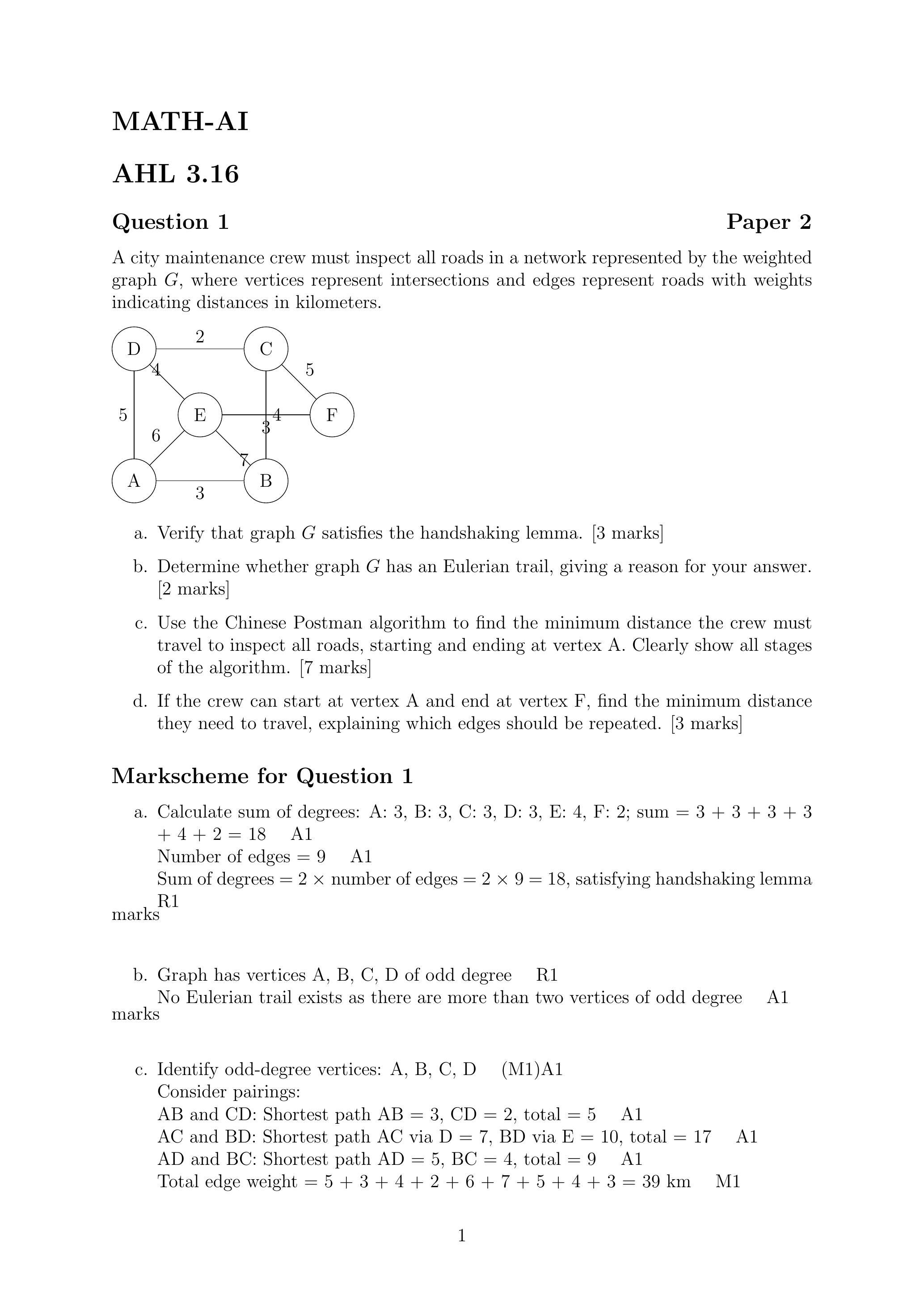 Practice AHL 3.16—Tree and cycle algorithms, Chinese postman, travelling salesman with authentic IB Mathematics Applications & Interpretation (AI) exam questions for both SL and HL students. This question bank mirrors Paper 1, 2, 3 structure, covering key topics like core principles, advanced applications, and practical problem-solving. Get instant solutions, detailed explanations, and build exam confidence with questions in the style of IB examiners.