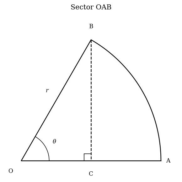The figure shows sector OAB of a circle with centre O and radius cm. The angle subtended at the centre, , lies between . A perpendicular line is drawn from the point to meet the radius at the point , forming the right triangle .