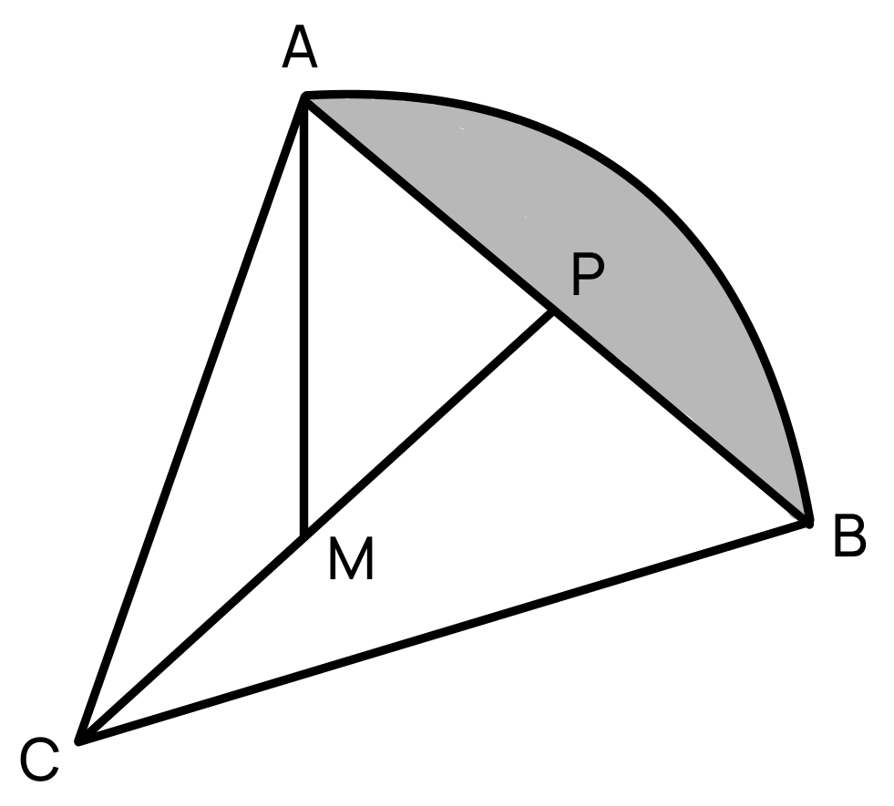 Consider an equilateral triangle where each side has a length of metre. Let be the midpoint of the segment , and let be the third vertex such that is the altitude of the triangle. The point is the midpoint of the segment . A circular arc, centered at , passes through the points and , forming a shaded region (a circular segment) bounded by the arc and the chord .