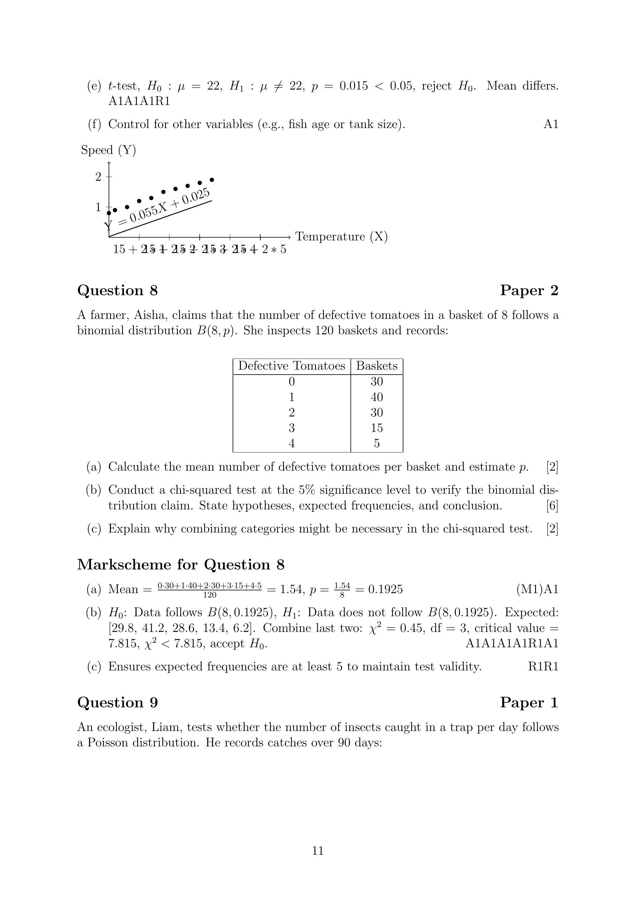 A marine biologist, Raj, investigates whether water temperature ( ) affects the swimming speed (m/s) of a fish species. He observes 10 fish in controlled tanks and records:
