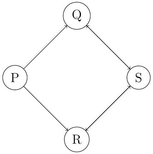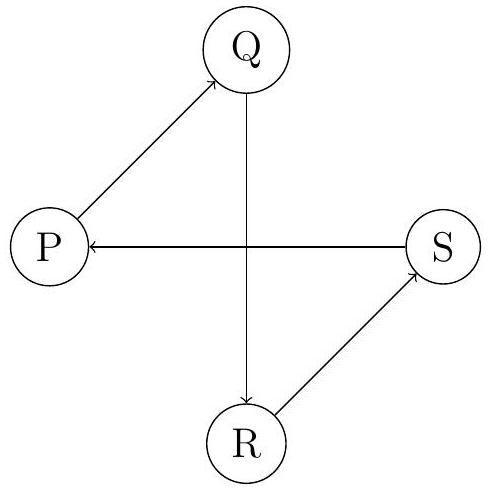 A network of tunnels connects four chambers labeled , and S . A robotic explorer moves between these chambers. When leaving a chamber, it selects an available tunnel with equal probability. The time between entering and leaving a chamber is constant for all transitions. The tunnel connections are represented by the following directed graph: