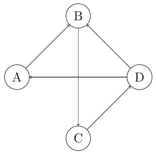 A network of paths connects four nodes, A, B, C, and D, as shown:
