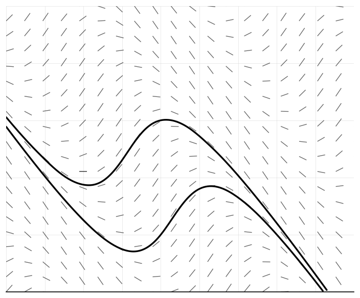 The diagram shows the slope field for the differential equation . The graphs of the two solutions to the differential equation that pass through points and are shown.