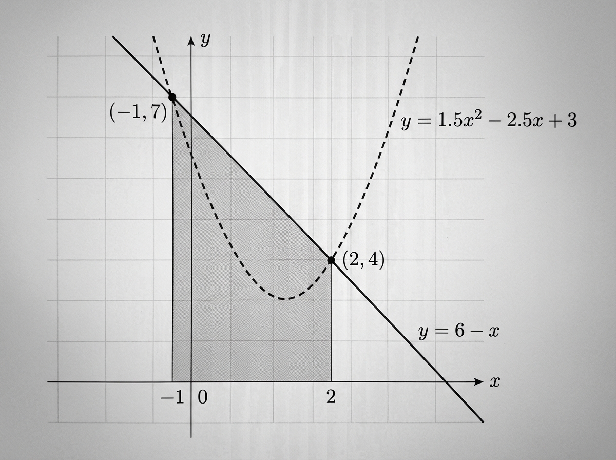Hence, determine the area enclosed between the line and the curve .