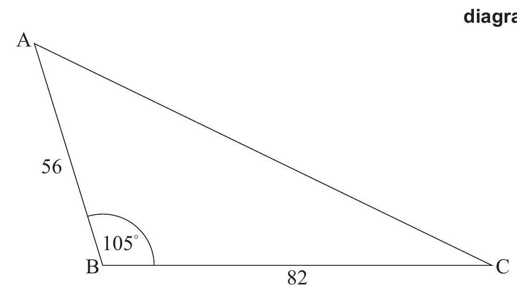 A triangular field ABC is such that AB = 56 m and BC = 82 m, each measured correct to the nearest metre, and the angle at B is equal to 105°, measured correct to the nearest 5°.