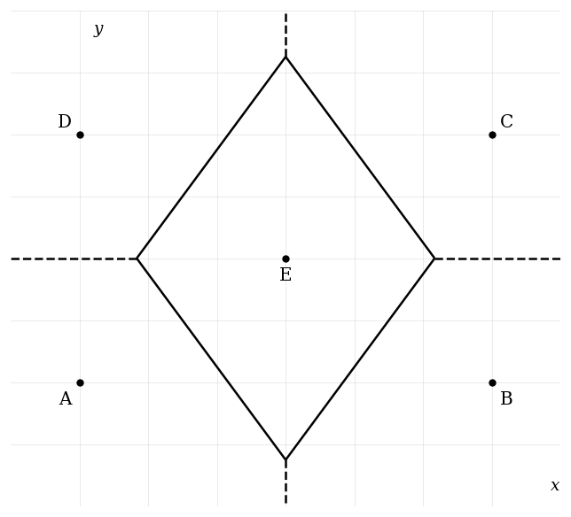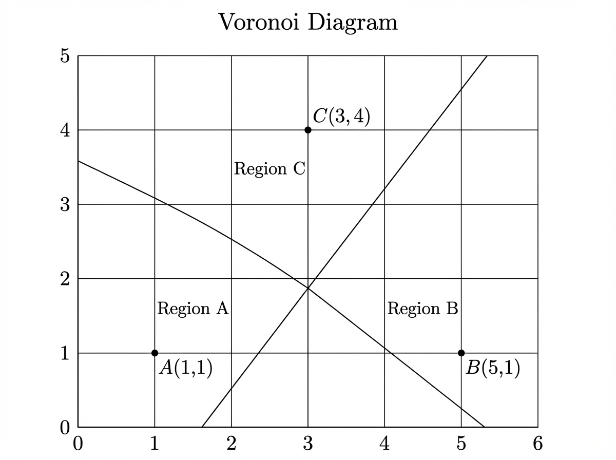 The diagram below shows a Voronoi diagram formed by five points: , , , , and . Each region corresponds to the area closest to one of the points.