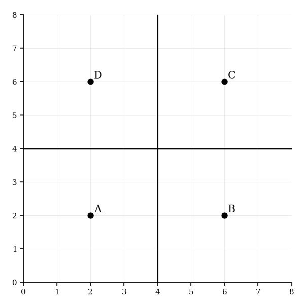 A Voronoi diagram is created using four shops located at , , , and . The shops are located within a square town bounded by and .