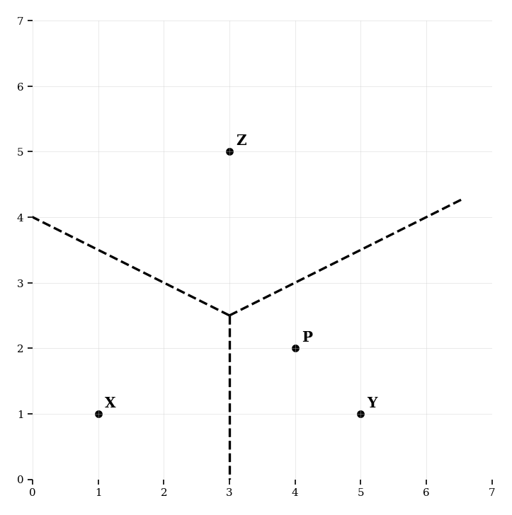 A Voronoi diagram is constructed using the sites , , and , as shown in the diagram below.