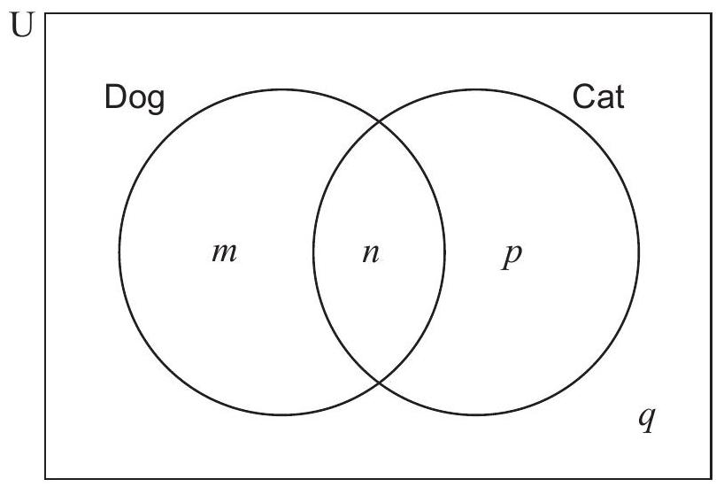 At Mirabooka Primary School, a survey found that 68% of students have a dog and 36% of students have a cat. 14% of students have both a dog and a cat. This information can be represented in the following Venn diagram, where m, n, p and q represent the percentage of students within each region.