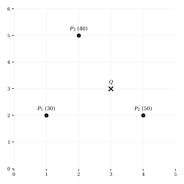 [5]The following diagram shows an air-quality monitoring network with three sensors at locations , , and , and a target location .