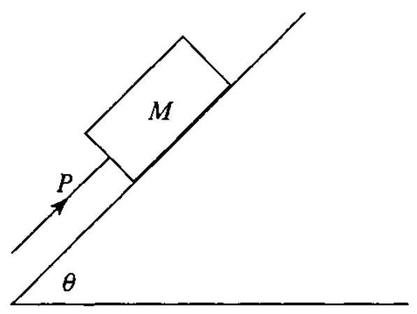 A force directed up a plane, of angle to the horizontal, prevents a block of mass from slipping down, as shown in the diagram.