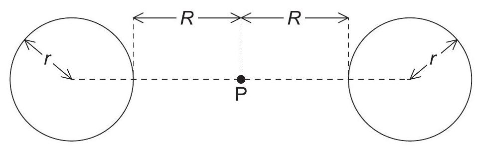 Point is the midpoint between the objects and is a distance from the surface of each object. What is the gravitational potential at point P ?