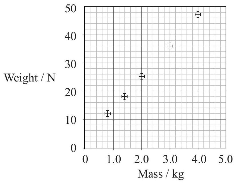 The masses and weights of different objects are independently measured. The graph is a plot of weight versus mass that includes error bars.
