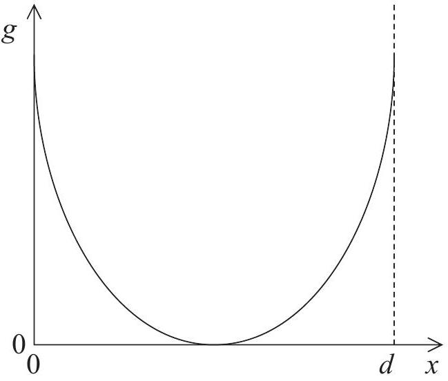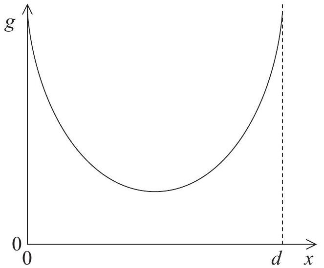 The gravitational field strength is measured on a line between the two masses. Which graph best shows the variation with distance from the larger sphere of the magnitude of the field strength ? The Earth's gravitational field is to be ignored.