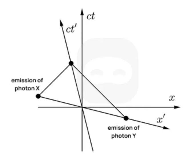 On the following spacetime diagram, is the world line of a spacecraft and is the space axis of its reference frame. Two photons, X and Y, are emitted towards the spacecraft. The emission and the world line of each photon is shown on the diagram.