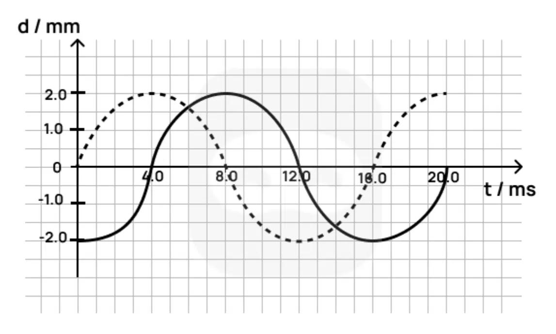 The graph shows the displacement-time representation of two transverse waves (solid and dashed) travelling through the same medium. Both waves have the same amplitude and frequency.