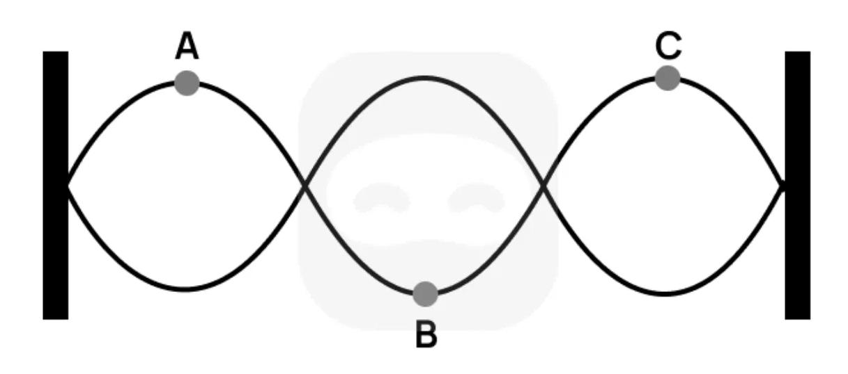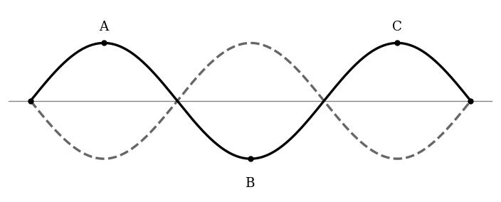 The diagram shows a standing wave on a string fixed at both ends. Three points, A, B, and C, are marked on the wave. The wave is oscillating in its third harmonic mode.