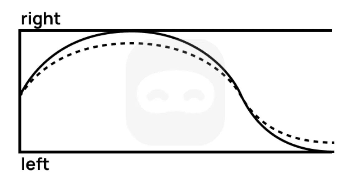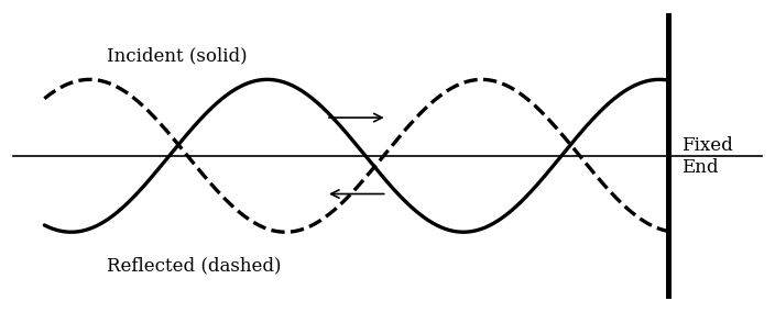 The diagram shows a wave moving along a string from left to right (solid line), followed by its reflection (dashed line) from the right-hand boundary. The two waves are of the same amplitude and frequency. This setup illustrates the formation of a standing wave.