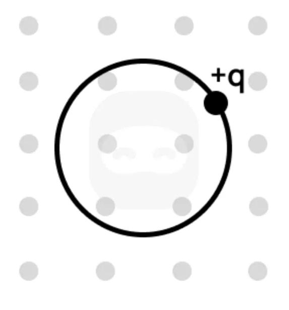 The diagram shows a positively charged particle with charge moving in a circular path in a region where the magnetic field is uniform and directed out of the page.