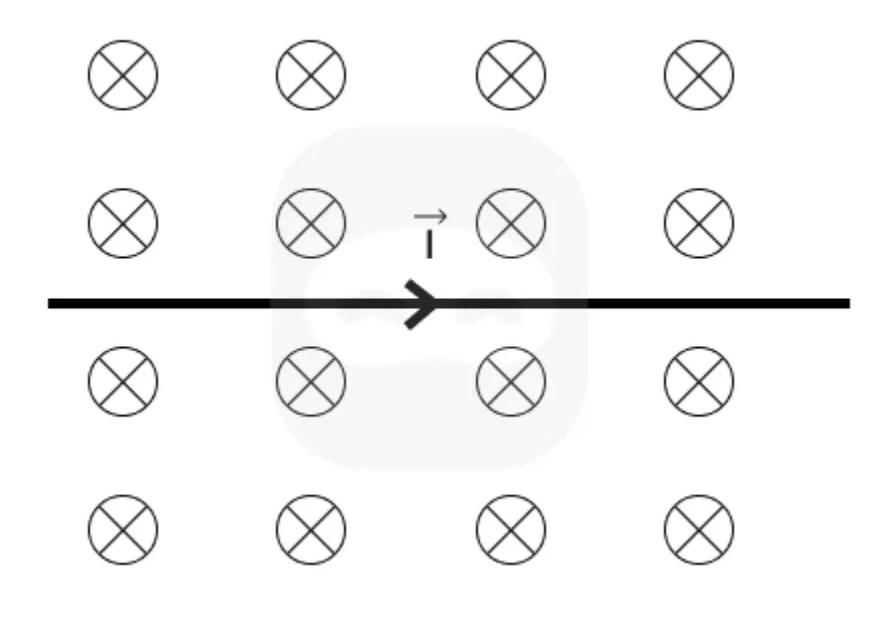 The diagram shows a straight conductor carrying an electric current into the page, as indicated by the arrow and dot. The circles with crosses represent a uniform magnetic field directed into the page.