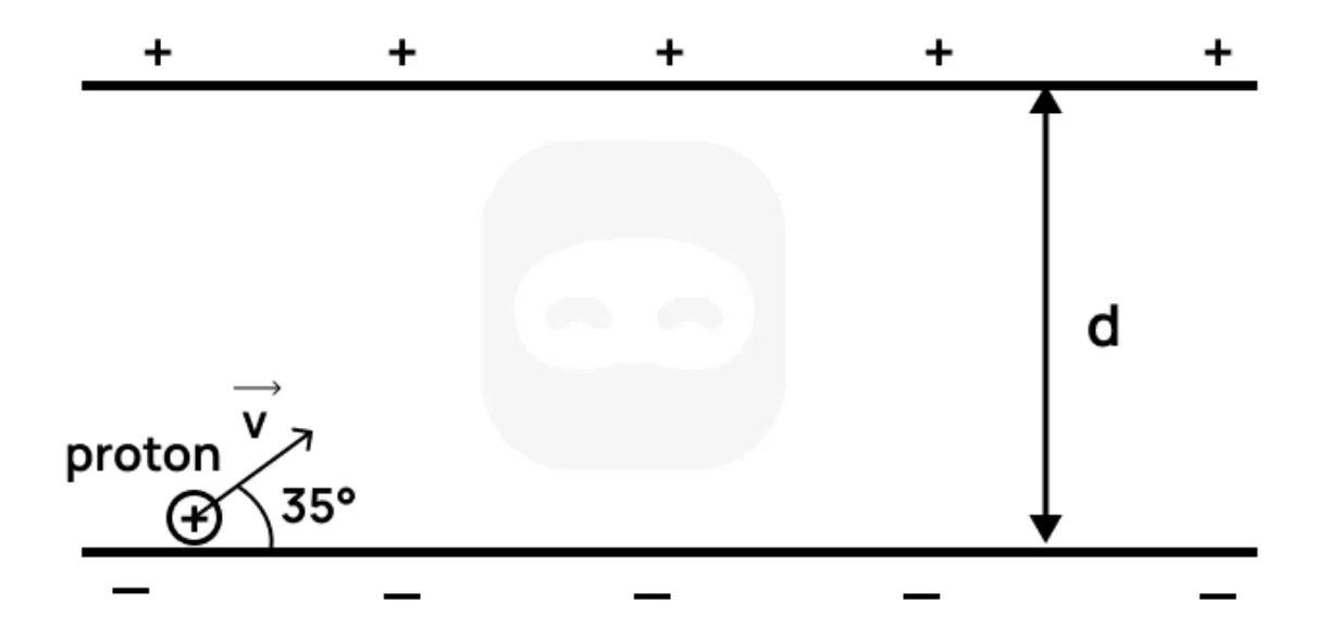 The diagram shows a proton entering a uniform electric field between two oppositely charged parallel plates. The electric field is directed vertically downward, and the proton enters with an initial velocity at an angle of above the horizontal.