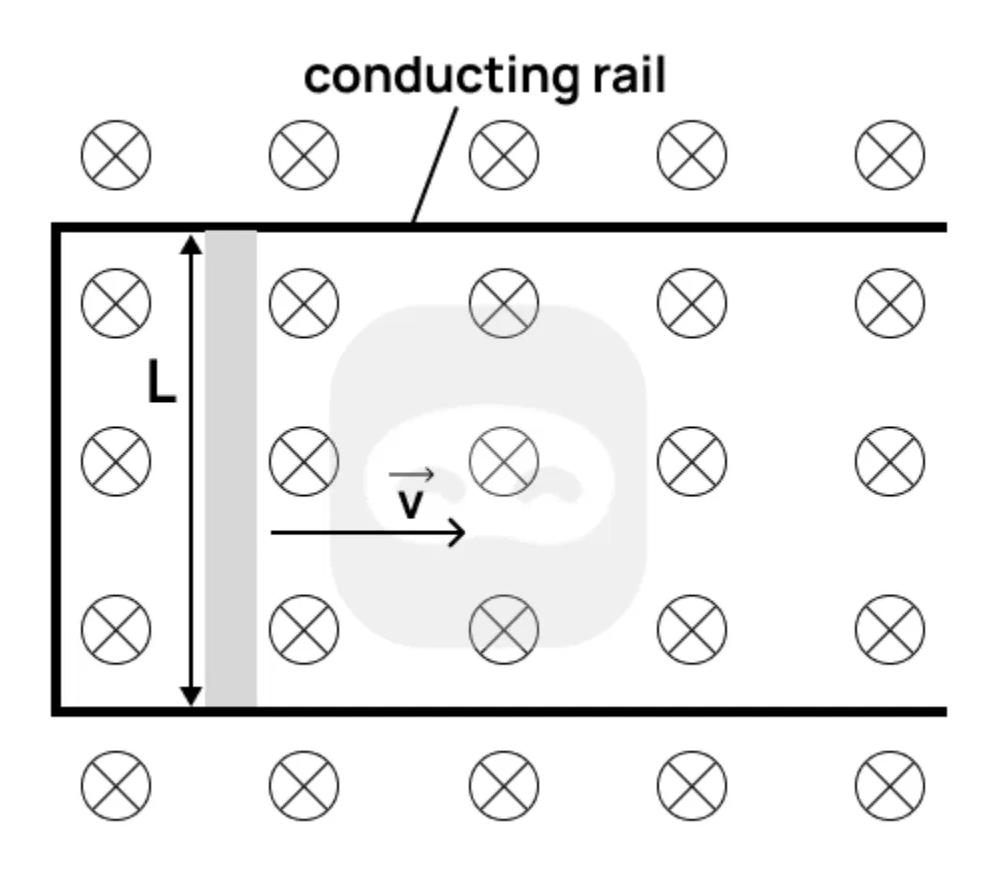 The diagram shows a conducting rod of length sliding to the right with constant velocity along two parallel conducting rails in a uniform magnetic field directed into the page. The system is part of a closed rectangular circuit.