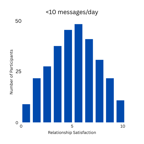 A clinic that specialised in couples therapy enlisted a team of researchers to explore predictors of relationship satisfaction in young adult couples. The researcher team was curious about the connection between the frequency of daily texting and/or instant messaging and relationship satisfaction. The participants included over 400 young adults in long-term romantic relationships, enrolled through an online ad; the age of participants varied between 18 and 30. Individuals filled out a virtual questionnaire that asked them to report the average number of messages exchanged daily with their partner, and relationship satisfaction on a 1–10 scale (scale was on a slider that allowed decimal values).
