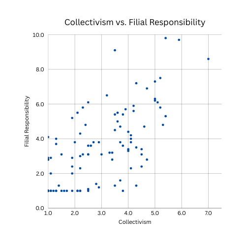 As part of the study, participants completed two researcher-created, standardised tests: a) Collectivism scale, measured on a scale of 1-7, b) Filial Responsibility scale, measured on a scale of 1-10. Higher scores on the collectivism scale suggested strong collectivist background, higher scores on the filial responsibility scale suggested a greater duty to one’s family.