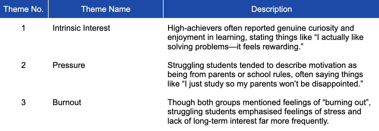 Researchers conducted semi-structured interviews with 20 students at an international school to gain information on what motivated students to study. Of these 20 students, 10 had been identified as teachers as “high-achieving” in academics. The other 10 had been identified as “struggling students.” Researchers audio-recorded and transcribed the interviews. They use thematic analysis to identify recurring themes in how students described their motivation.