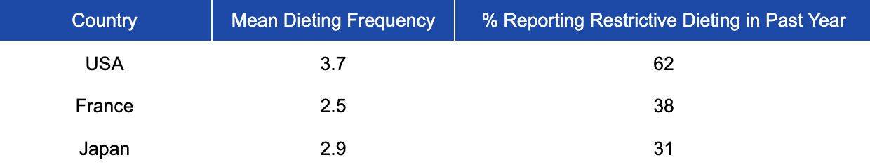 A research team interested in looking at dieting behaviour in young people conducted a survey of nearly 450 university students, all aged between 18 and 24. The students came from the USA, Japan, and France. The survey was simple, participants simply had to indicate how frequently they engaged in dieting behaviour on a Likert scale; lower scores indicated less dieting behaviour. In the table below, “mean dieting frequency” refers to the number of new diets begun in the last 5 years; “% Reporting Restrictive Dieting in Past Year” refers to the number of individuals self-reporting a calorie consumption below the recommended daily intake, at least several days a month: