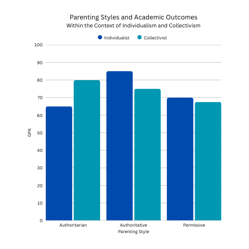 Researchers at an institute for child development were interested in investigating the relationship between parenting style and academic outcomes. In particular, the researchers were curious whether this would differ across cultural contexts. The sample consisted of 600 adolescents, between the ages of 15 and 17, who attended the local high school. The researchers had already pre-determined whether the children came from collectivist (N = 130) or individualist backgrounds (N = 170) before conducting the survey. The adolescents self-reported the parenting style of their guardians, classifying it as authoritarian, authoritative, or permissive. The academic performance of each participant was sourced from the school, the performance was measured using Grade Point Average (GPA) on a 100 point scale.
